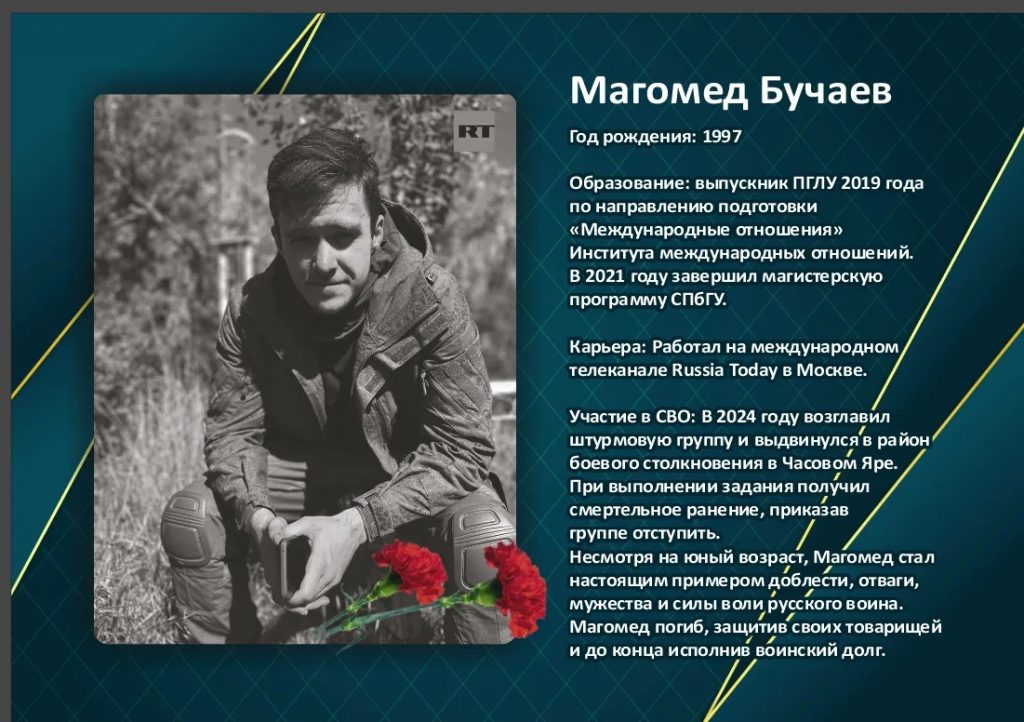 Ушел из жизни, но оставил о себе добрую память бывший выпускник ПГУ Магомед Бучаев. Работал на международном телеканале «RT» в Москве. В 2024 году возглавил штурмовую группу и выдвинулся в район боестолкновения в Часовом Яре. При выполнении задания он получил смертельное ранение, приказав группе отступить. Магомед погиб, защищая своих товарищей и до конца исполнив воинский долг.