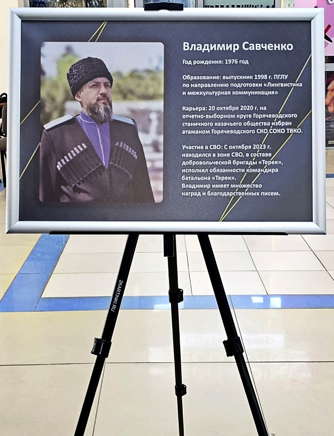 На фотографиях живые и погибшие герои, которыми гордится университет. Среди них и казачий полковник, ветеран СВО, депутат пятигорской Думы Владимир Савченко. В октябре 2023 года он ушел добровольцем на фронт. Больше года выполнял боевые задачи в составе казачьей разведывательной бригады «Терек», был командиром батальона «Терек». Имеет множество наград, среди которых и орден Мужества.