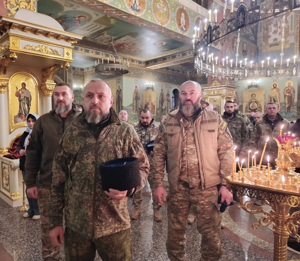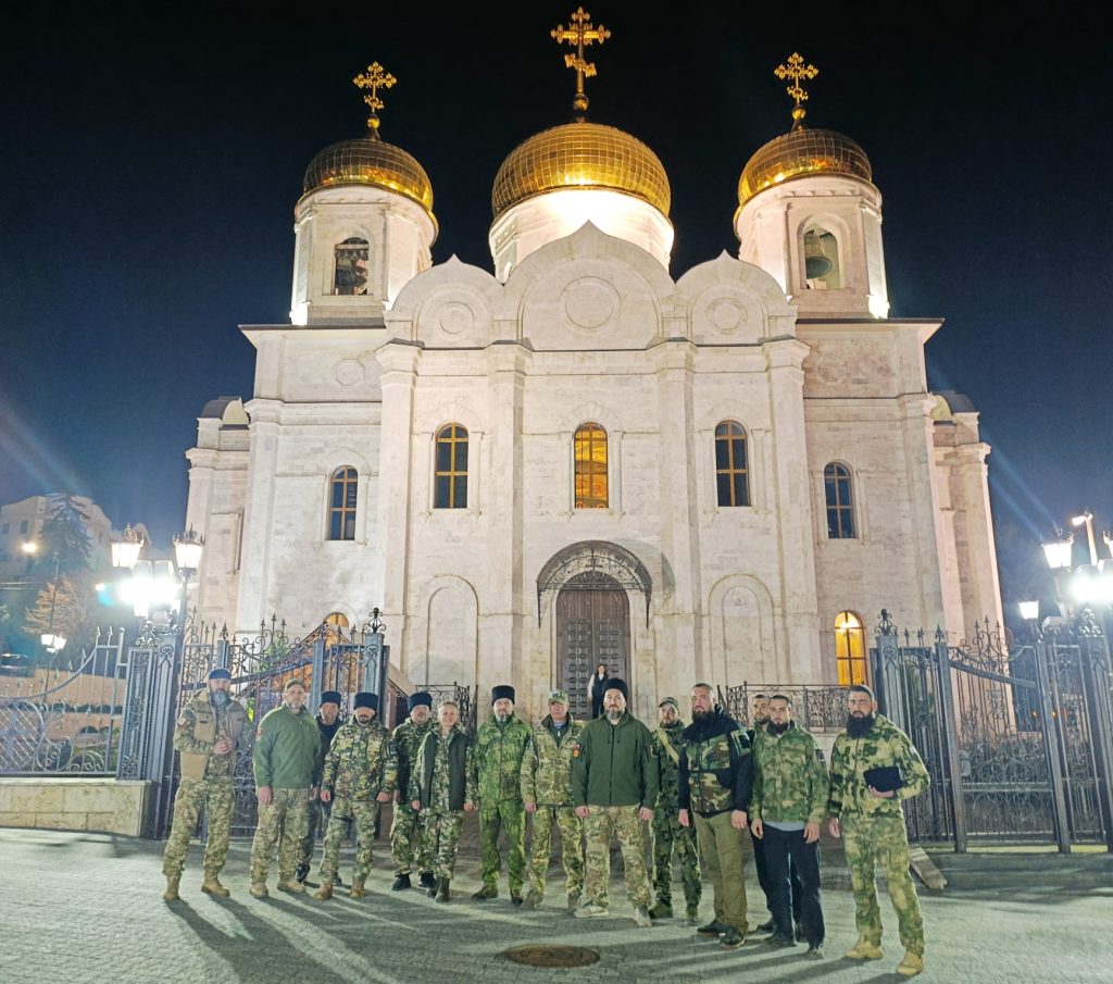 Традиционно перед дальней дорогой казаки зашли в храм помолиться. В Спасском кафедральном соборе Пятигорска находится ковчег с частицей мощей апостола Варфоломея — святого покровителя Терского казачьего войска. Поэтому перед тем, как отправиться в зону боевых действий, станичники просят заступничества и помощи у Царицы Небесной и своего святого.
